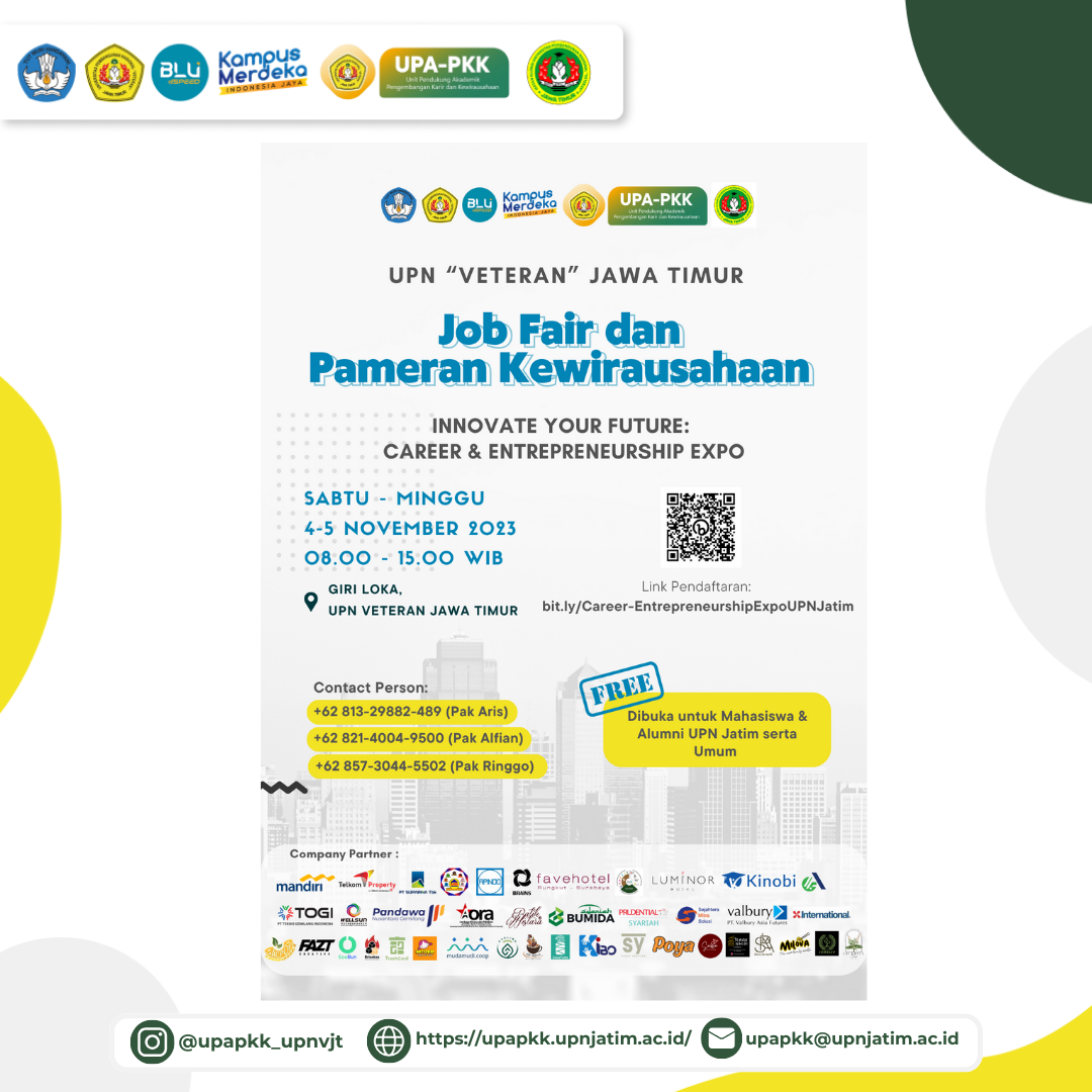 UPN Veteran Jawa Timur melalui UPA-Pengembangan Karir dan Kewirausahaan melaksanakan Job Fair dengan tema Innovate Your Future: Career & Entreprenuership Expo. Dengan berpartisipasi di Job Fair ini dapat memberikan 2 peluang bagi para lulusan yaitu peluang karir dan kewirausahaan.Job Fair dan Pameran Kewirausahaan akan memfasilitasi talkshow karir, talkshow kewirausahaan, pameran lowongan pekerjaan dan kewirausahaan bagi mahasiswa serta fresh graduate untuk membantu dalam karir dan merencakan strategi bisnis yang bijak