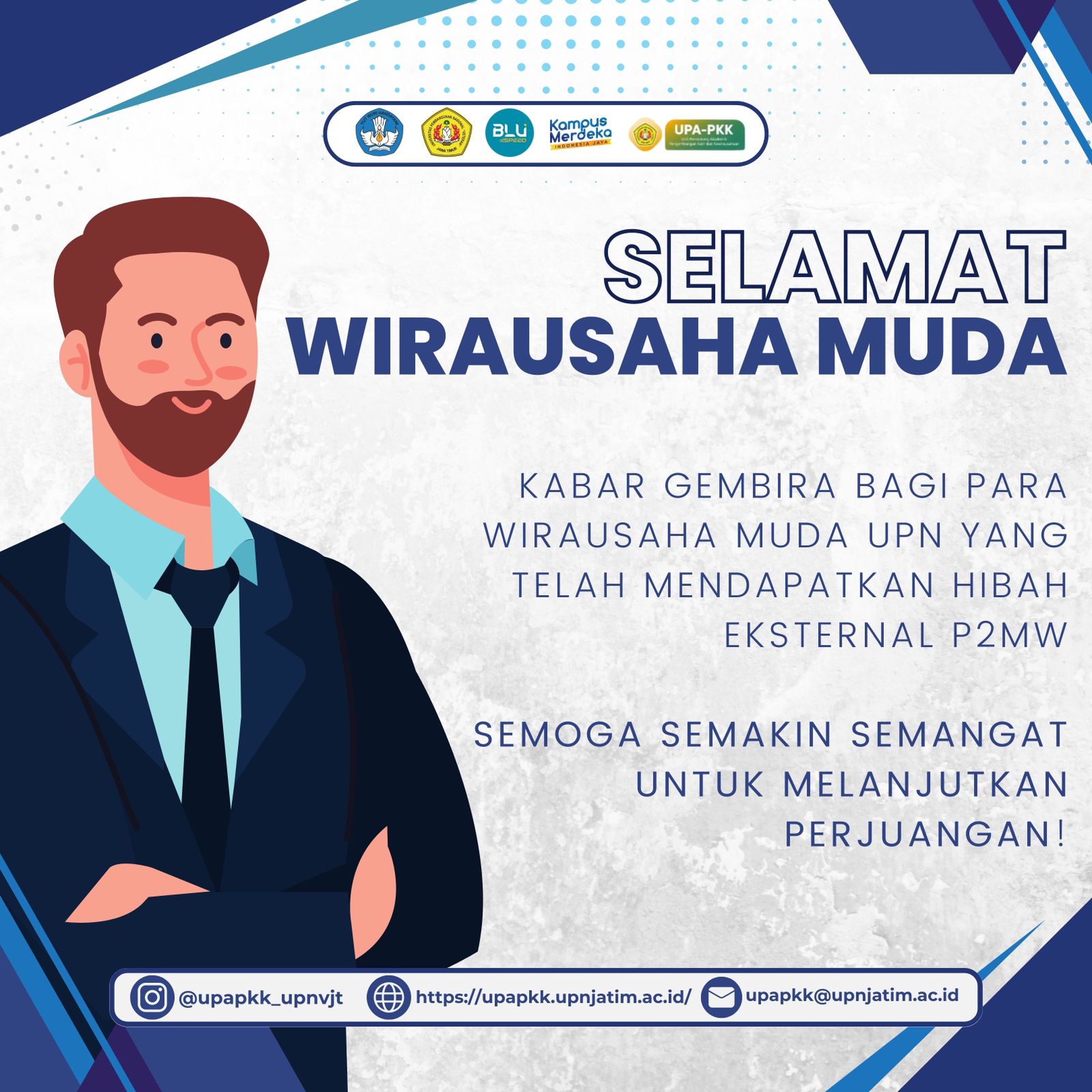 Salam Wirausaha Muda! Kabar gembira datang bagi para wirausaha muda di UPN "Veteran" Jawa Timur! Baru-baru ini, mereka telah berhasil meraih hibah eksternal P2MW (Program Pendanaan untuk Meningkatkan Wirausaha Muda). Keberhasilan ini patut disyukuri dan diapresiasi, serta diharapkan dapat menjadi pendorong semangat bagi para wirausaha muda untuk terus melangkah maju dalam perjuangan mereka. Selamat kepada para wirausaha muda UPN yang telah berhasil meraih hibah eksternal P2MW. Semoga keberhasilan ini menjadi langkah awal dalam perjalanan menuju kesuksesan yang lebih besar. Teruslah berinovasi, belajar dari pengalaman, dan berani menghadapi tantangan. Salam wirausaha muda! 1. Ketua Tim : Feri Ardiansyah Judul : Macpop Jenis : Makanan dan Minuman Pembimbing : Alfiandi Imam Mawardi, S. Hub, Int, MB 2. Ketua Tim : Faiz Umar Hadi Judul : ECOBUN INOVASI SABUN LERAK BERBENTUK TABLET SEBAGAI PEMBERSIH INOVATIF SUSTAINABLE 5.0 Jenis : Industri kreatif, seni, budaya, dan pariwisata Pembimbing : Alfiandi Imam Mawardi, S. Hub, Int, MB 3. Ketua Tim : Mohamad Danang Imam Danu Arta Judul : Cocotube Mushroom Solusi Kebutuhan Masyarakat Akan Jamur Tiram Berkualitas ditengah Keterbtasan Lahan Jenis : Budidaya Pembimbing : Egan Evanzha Yudha Amriel, S.Mn, MM. 4. Ketua Tim: Faiza Akmal Zaidaan (22082010178) Judul: FAZT CREATIVE Small and Medium Enterprise Creative Marketing Assistant Jenis: Jasa dan Perdagangan (Bertumbuh) Pembimbing: Arista Pratama, S.Kom, M.Kom 5. Ketua Tim: Adi Bimantoro Judul: “SARLING (Sabun Ramah Lingkungan) : Deterjen Serbaguna Eco-Friendly Berbahan Dasar Jelantah” Jenis : Manufaktur dan Teknologi Terapan Pembimbing: Ayundha Evanthi, SE, MM 6. Ketua Tim : Rendy Adetya Rahmatullah Judul : KIBO kios box portable Jenis : Manufaktur dan Teknologi Terapan Pembimbing : Nurkholish Majid, SE, MM 7. Ketua Tim : Putri Kurnia Sari Judul : GO GREEN CHOP Jenis : Industri kreatif, Seni, Budaya, dan Pariwisata Pembimbing : Putra Perdana, S.E., M.Sc. 8. Ketua Tim: Afif Ghani Zahran Judul: Trashcare Jenis: Bisnis Digital Pembimbing: Arista Pratama, S.Kom, M.Kom 9. Ketua Tim : Linda Oktafia Judul : BRISEKAS Jenis : Industri Kreatif Pembimbing : Arief Budiman, S.AB., M.AB. 10. Ketua Tim : Agung Pambudi Judul : Poya Latte Jenis : Makanan dan Minuman Pembimbing : Dra. Ec. Nurjanti Takarini, M.Si. 11. Ketua Tim : Rinjani Eko Putri Judul : Risa Bouquet Jenis : Jasa dan Perdagangan Pembimbing : Arief Budiman, S.AB.,M.AB. 12. Ketua Tim : Sail Hidayatullah Judul : Terrarium Jenis : Budidaya Pembimbing : Zumrotul Fitriyah, S.E., M.M