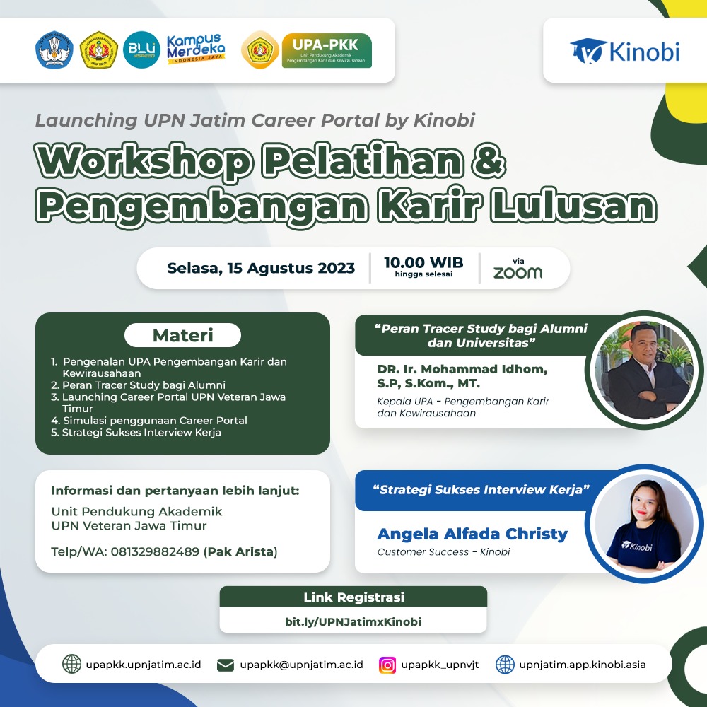 UPN Jatim dan Kinobi akan melaksanakan coaching career untuk alumni UPN Jatim. Coaching career ini dilaksanakan dengan tujuan untuk meningkatkan kapabilitas alumni UPN Jatim dalam menghadapi dunia karir.